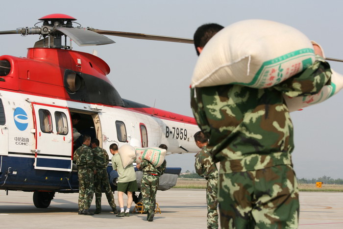 5月19日,在广汉机场开展的民航直升机抗震救灾工作继续有序开展,当天共出动救灾飞机26架次,先后飞抵德阳伐木场、清平乡、红白镇附近、天池、北川禹里等灾区,投放救灾食物7.734吨,发电机10台,大量医疗物资、救生衣,救生船等,在完成物资运输和投放的任务时,救灾飞机还抢运出伤员和灾民199名。
