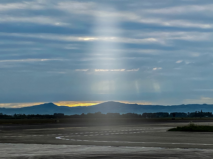 4月4日早上,气象台观测站值班员于03:45分起床,对云况、能见度、天气现象以及温度、湿度、气压等各项天气要素进行了认真细致的观测和记录,并于开飞前1.5小时发布了广汉机场第一份例行天气报告。气象台预报员认真分析了当天的地面图、高空图、数值预报产品、云图等常规天气资料,并于04:30分制作和发布了第一份2106预报。05:30分,校飞飞机顺利起飞。