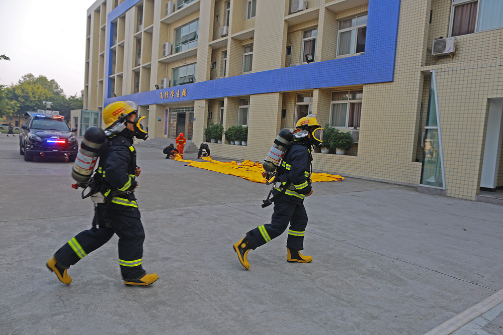 与此同时,派出所接报警后立即派出应急救援车和消防车各一辆迅速到达现场,两名消防队员全副武装进入火场解救两名被困学生,消防队员在楼下铺设了救生气垫,并成功扑灭了大楼火灾。