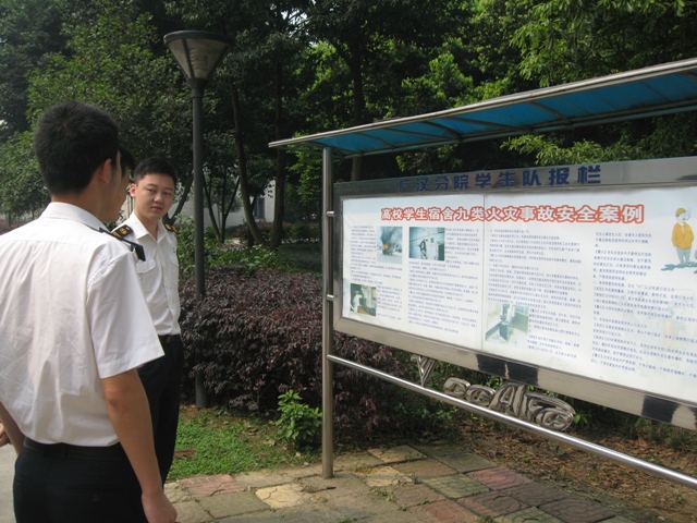 今天早上,学生们正在认真的观看事故警示宣传栏——高校学生宿舍火灾事故安全案例。对于飞行而言,安全是生产的第一保证。夏季到来,飞行学生宿舍用电安全则是学生安全保障的重中之重,学生队为此展开了夏季用电.防火等安全教育,逐一排查了学生队存在的安全隐患,切实提高了安全防控的意识和能力。